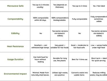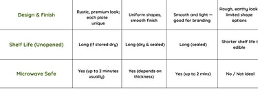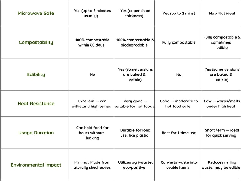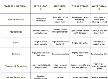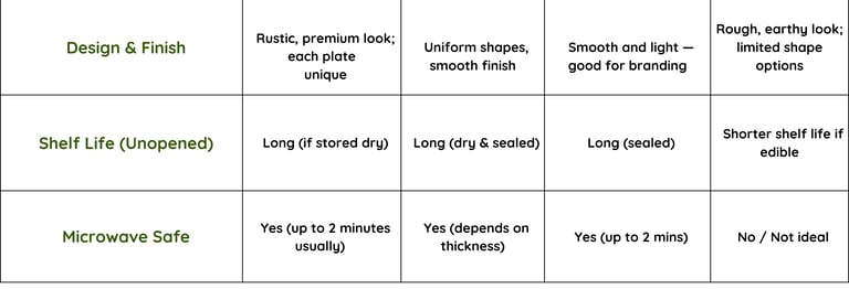 Our products are made from natural, biodegradable materials. As a result, slight variations in color, texture, shape, thickness, and grain patterns may occur between batches. These natural differences are normal and reflect the unique properties of the raw materials used.