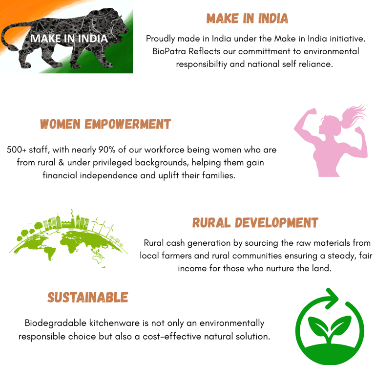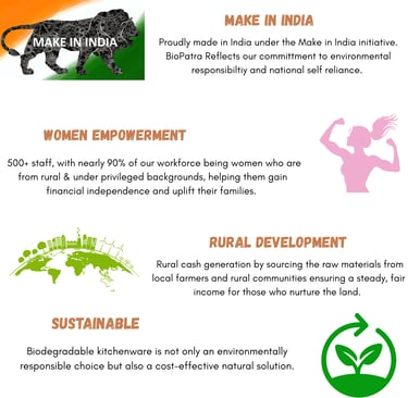 At BioPatra, our mission is to create a cleaner, greener future by delivering sustainable, biodegradable tableware solutions that are 100% compostable and environmentally safe. We are committed to empowering rural communities, supporting sustainable agriculture, and leading the shift toward conscious, eco-friendly living — proudly Made in India.